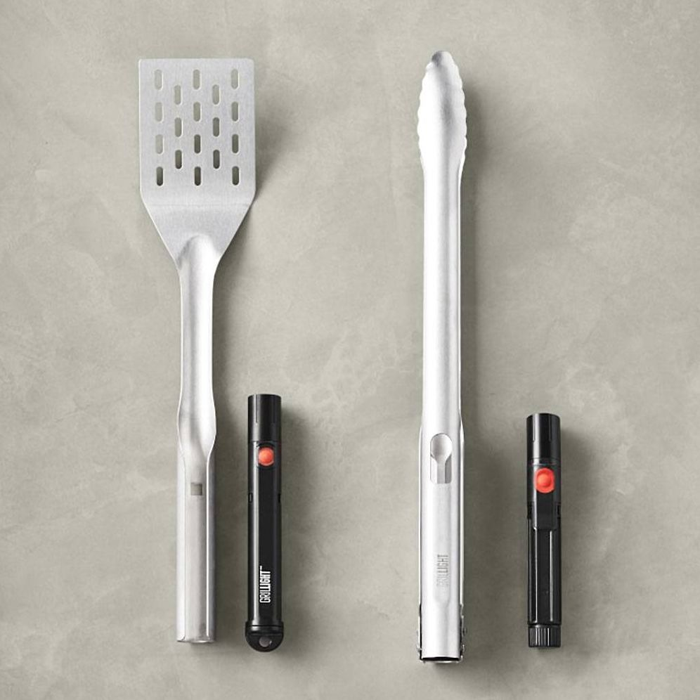 Be ready for the next barbeque with this tongs & spatula duo from Grillight. These tools feature high-output Ideal Illumination‚Ñ¢ LED Grill-Light built into their handles. Other features include: One handed locking mechanism for storage. waterproof light. restaurant grade 430 stainless steel. dishwasher safe. 20.000 hour bulb life. AA Batteries Included. US & International Patented.
