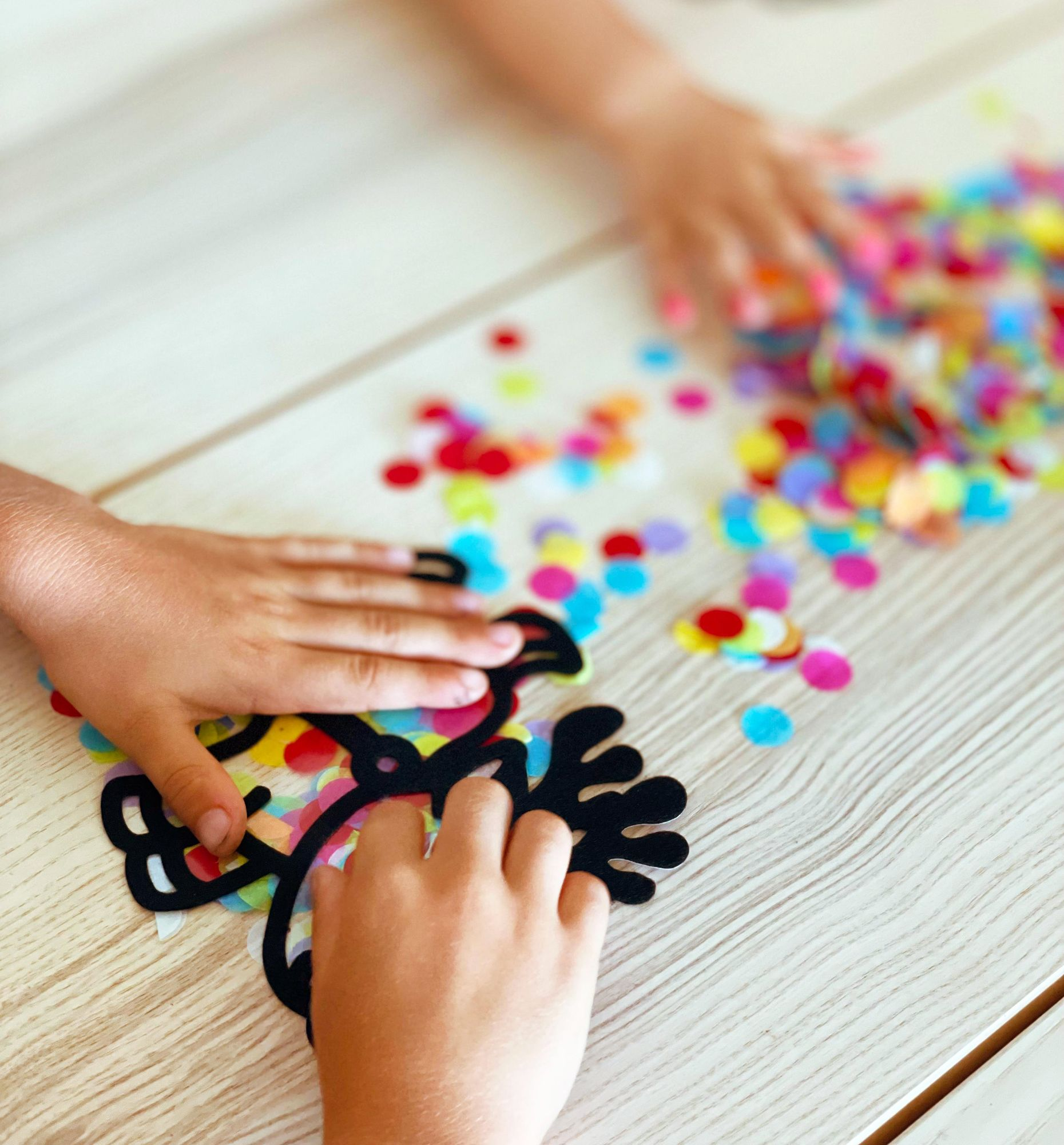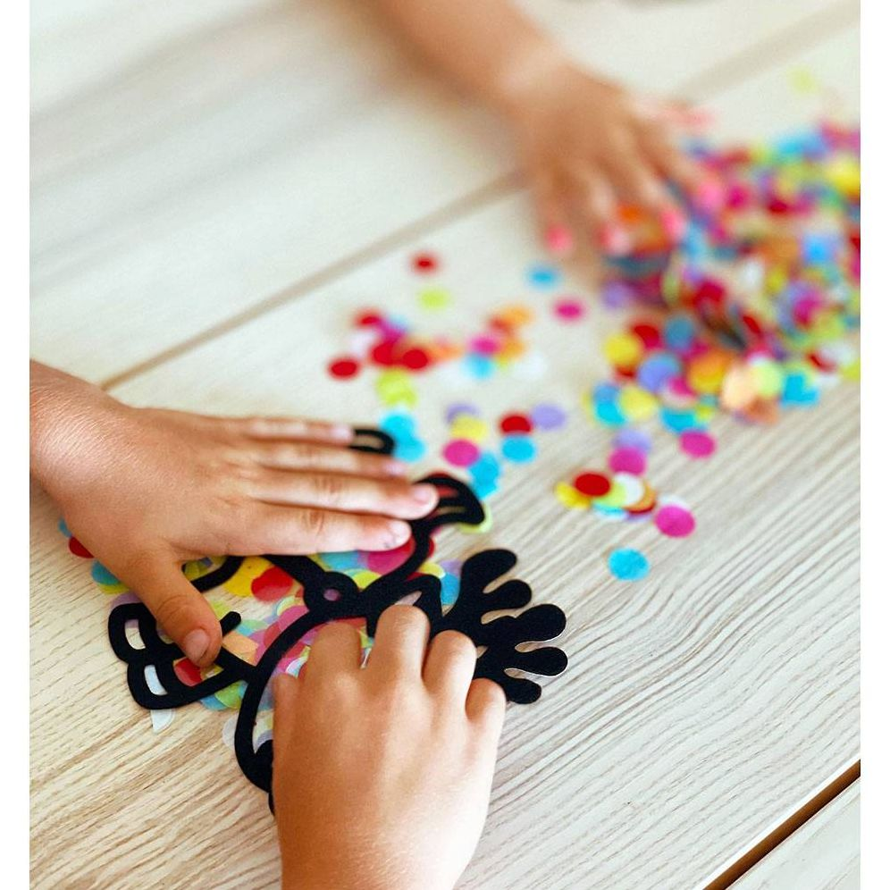 Includes: 4 (2-piece) felt frame shapes. assorted multi-colored tissue paper circles. 4 suction cups and instructions. all in a holiday keepsake storage box made from recycled cardboard.