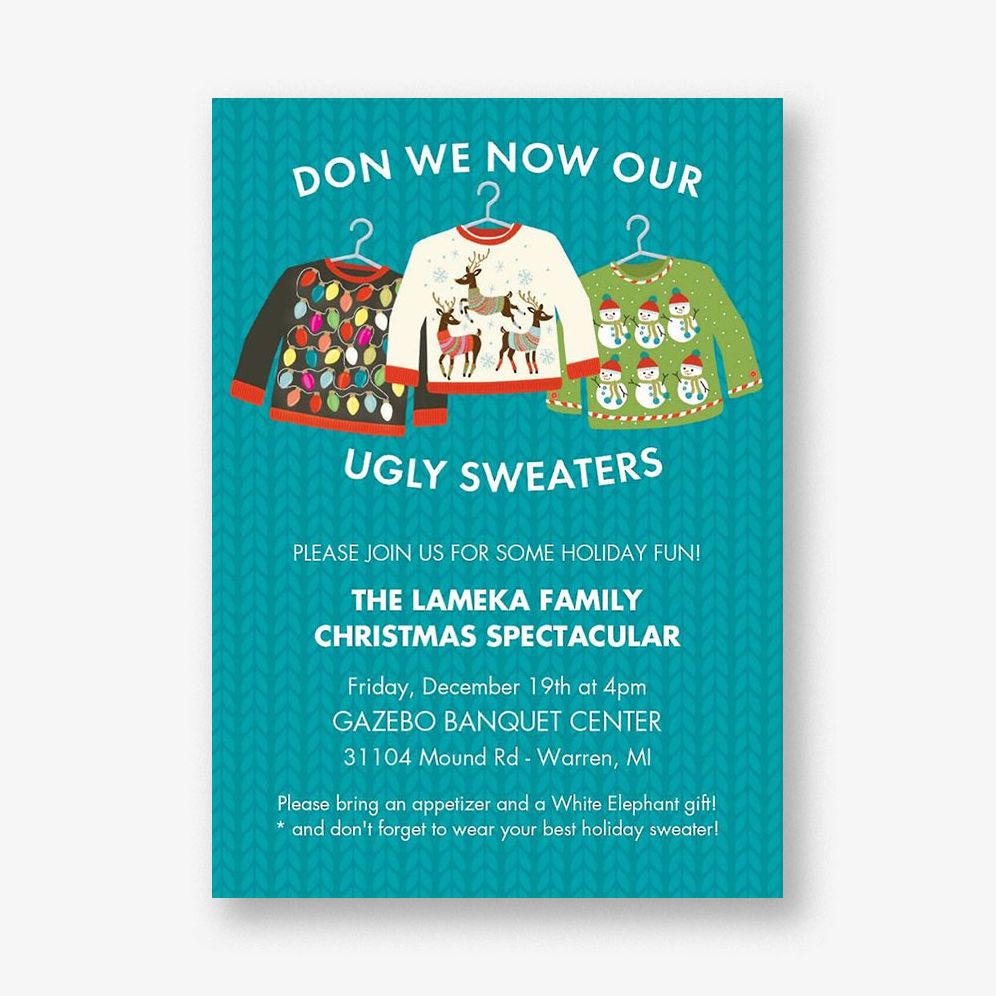 It’s that time of year! Invite friends and family over to show off their ugliest holiday sweaters. Argyle and embroidery are sure to abound. Printed on Mohawk ultra white 120 lb. card stock that is soft to the touch and matches our superfine white envelopes. Paper is FSC certified and made using wind power.