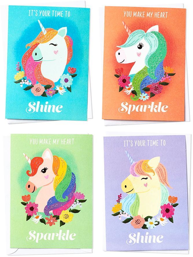 What says Valentine’s Day more than sparkles and unicorns! This cute and glittery set features 28 cards. four of each design.