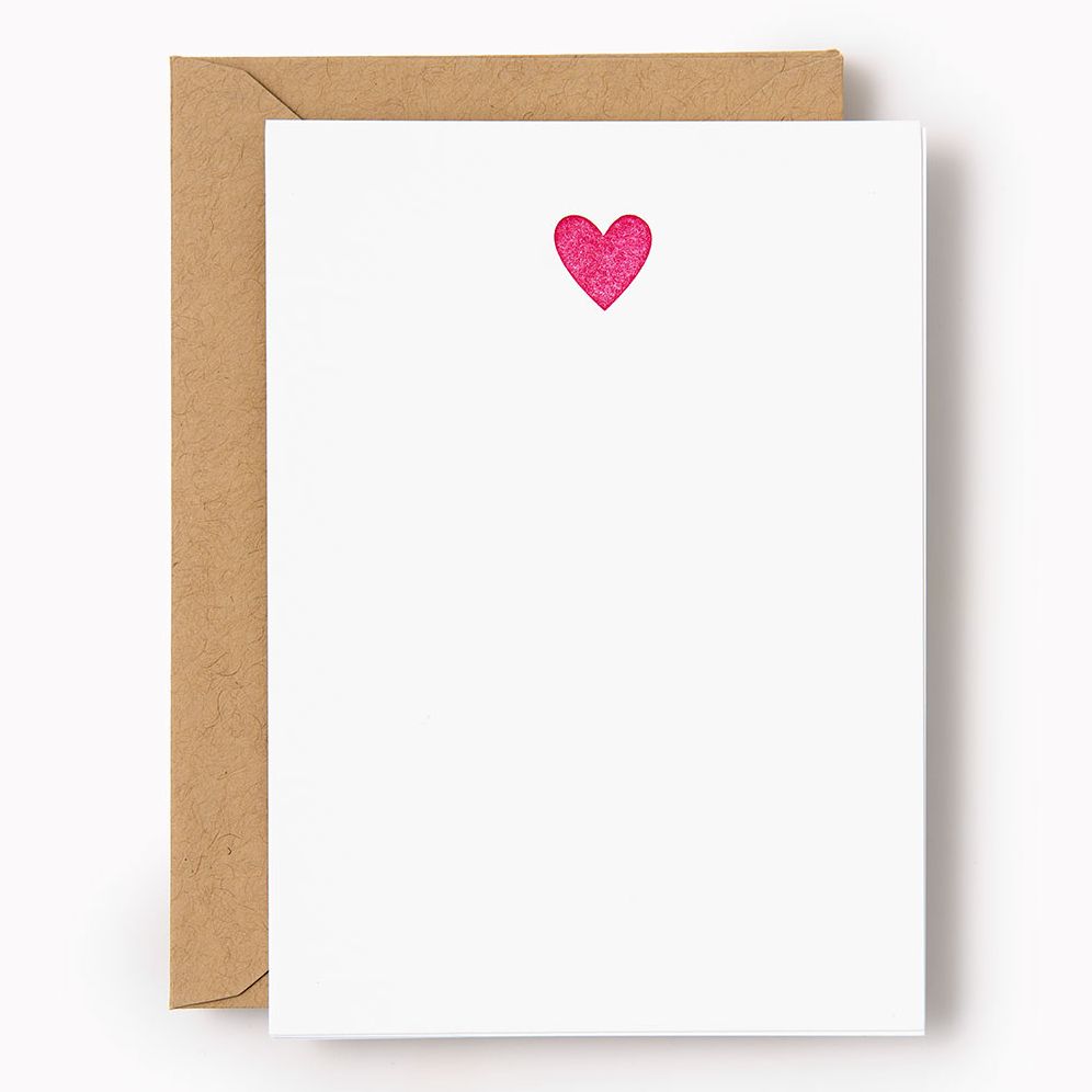 A fuchsia heart letterpress printed onto luxe paper makes this a simple. sweet card set. Paired with bold fuchsia envelopes that can be dressed up with colored labels. stickers and rubber stamps!