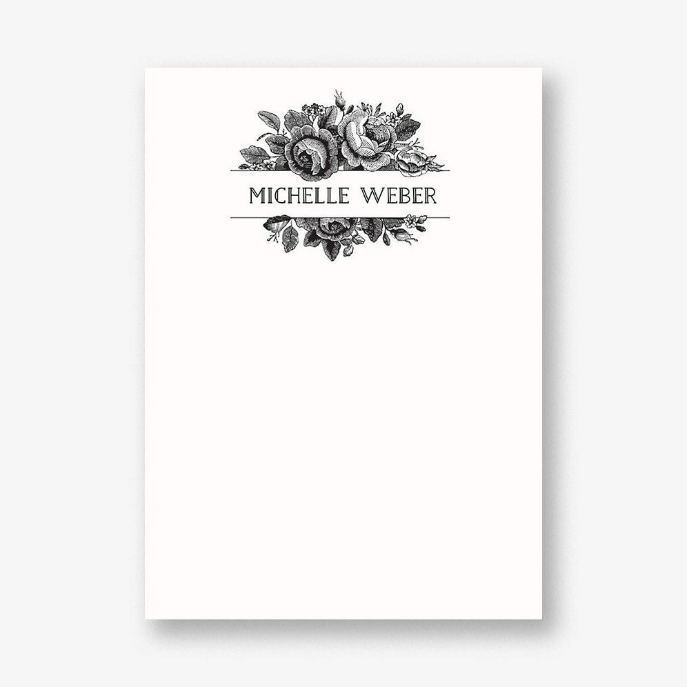 Simple and sophisticated. this romantic stationery design is perfect for a vintage look. Beautiful floral etchings frame your name in thinly-lined type. Printed on superfine white paper. which has a smooth finish and is soft to the touch. 130# cover weight paper with 30% post consumer recycled content.