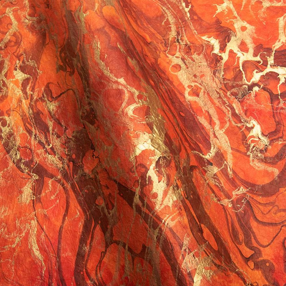 These Thai momi marbled papers are initially machine made from kozo and bamboo pulp. then hand-marbled and crumpled using the following technique. Oil-based paints are added to a tub of water. The paint. which floats atop the water. is moved around to create a swirling pattern. The base sheet of paper is then laid atop the water. grabbing the swirling paint pattern. then quickly removed. The sheet is then set aside to dry. Once dry. additional colors are added using the tie-dye process. The sheet is then crumpled to produce it?ÇÖs soft cotton-like feel. and set aside to dry once more. This artistic technique creates a unique one-of-a-kind design each time.