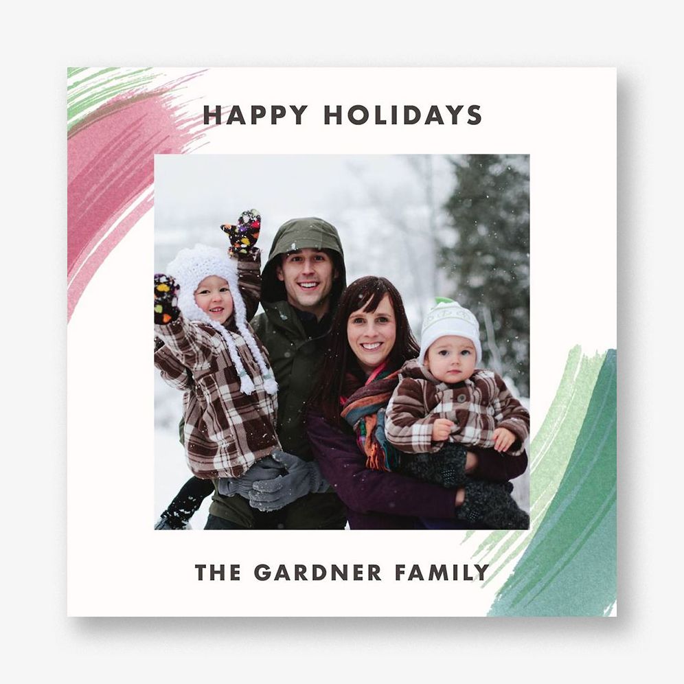Red and green watercolor brushstrokes frame your photo on this lovely square holiday photo card from the designers at Paper Source. Personalize your message and use the back to send more photos or updates of your year! Printed on Mohawk ultra white 120 lb. card stock that is soft to the touch and matches our superfine white envelopes. Paper is FSC certified and made using wind power.