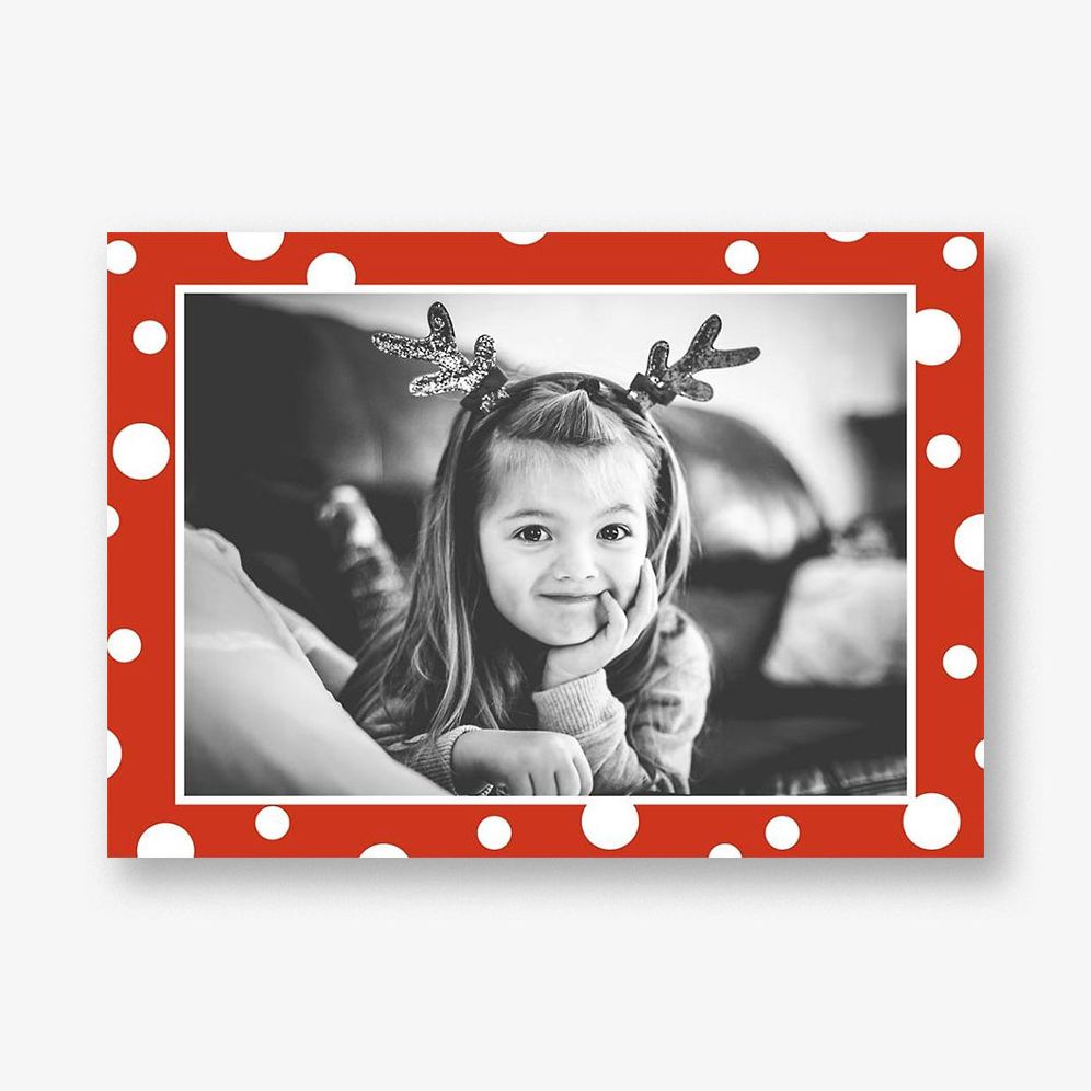 Red and white polka dots create a fun holiday border on this horizontal photo card from the designers at Paper Source. Personalize your message and use the back to send more photos or updates of your year! Printed on Mohawk ultra white 120 lb. card stock that is soft to the touch and matches our superfine white envelopes. Paper is FSC certified and made using wind power.