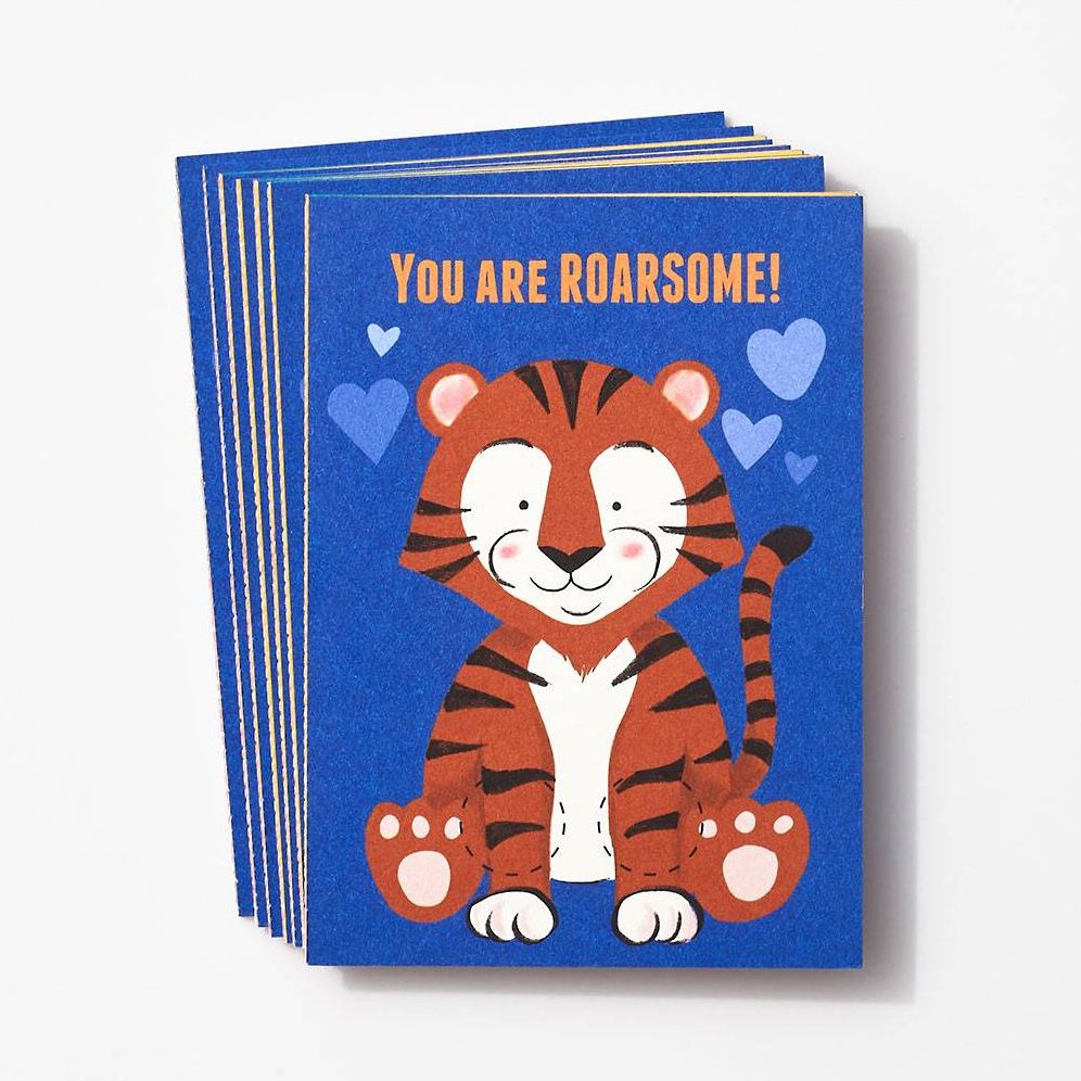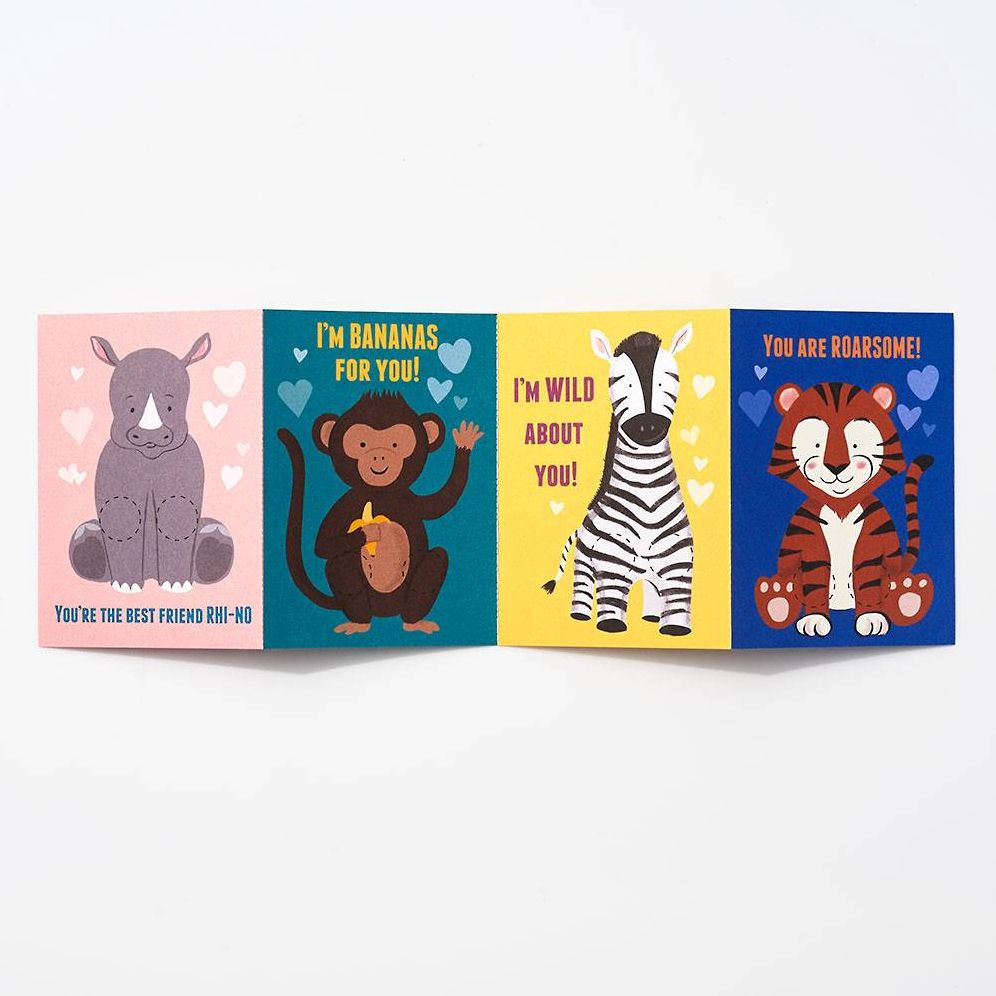 This pack of jungle-themed Valentines includes four unique card designs featuring fun animals and punny sayings. Set of 28 double-sided flat cards with room to address each on the opposite side. Perfect for classroom Valentine’s Day parties!