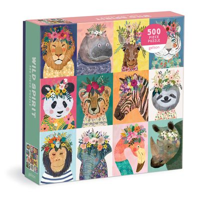 Wild Spirit 500 Piece Puzzle from Galison playfully illustrates 12 animal heads festooned with various beautiful flowers. Galison puzzles are packaged in matte-finish sturdy boxes. perfect for gifting. reuse. and storage.