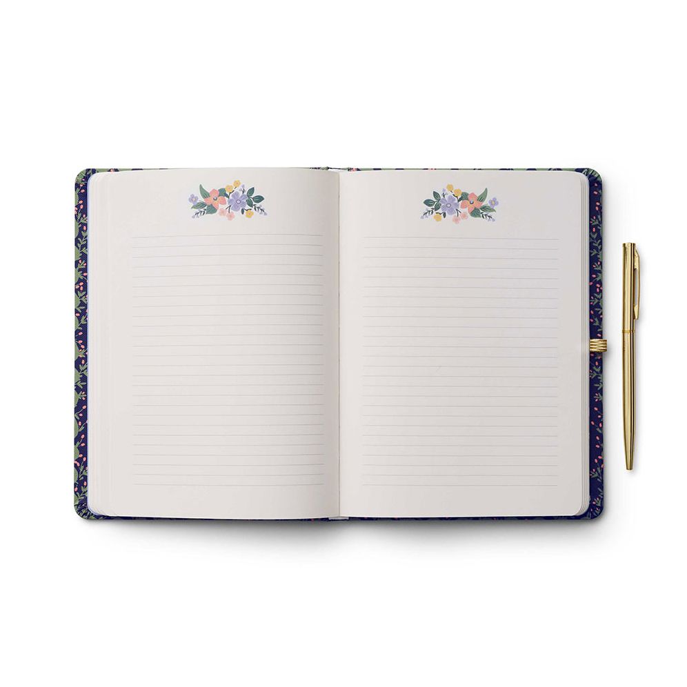 Designed for note takers and journalers. this hardcover journal comes with a gold pen with black ink. and features 144 ruled pages. an elastic band. and a pocket for extra storage.
