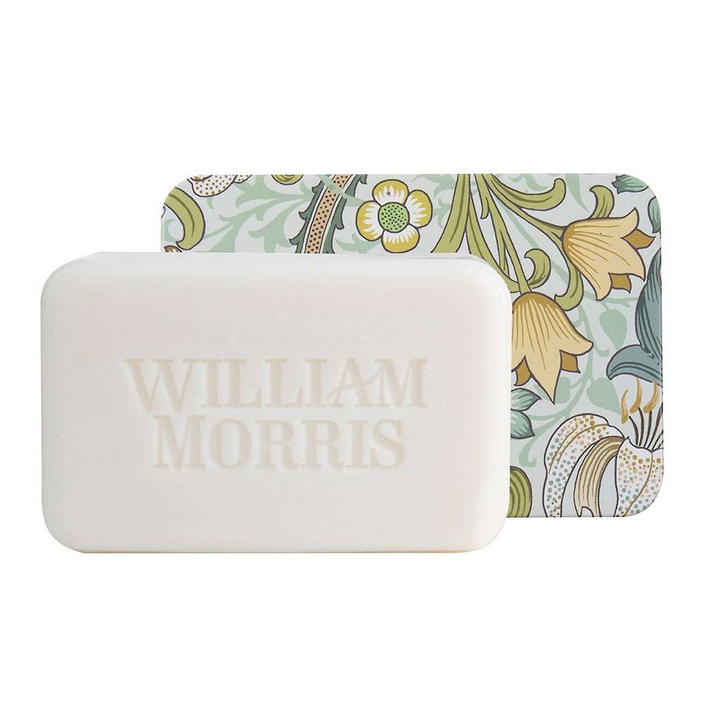 Travel friendly. French milled hand soap with scents of rose. jasmine and summer florals. reminiscent of a cottage garden. Packaged in a beautiful tin adorned with a design adapted from Golden Lily wallpaper.