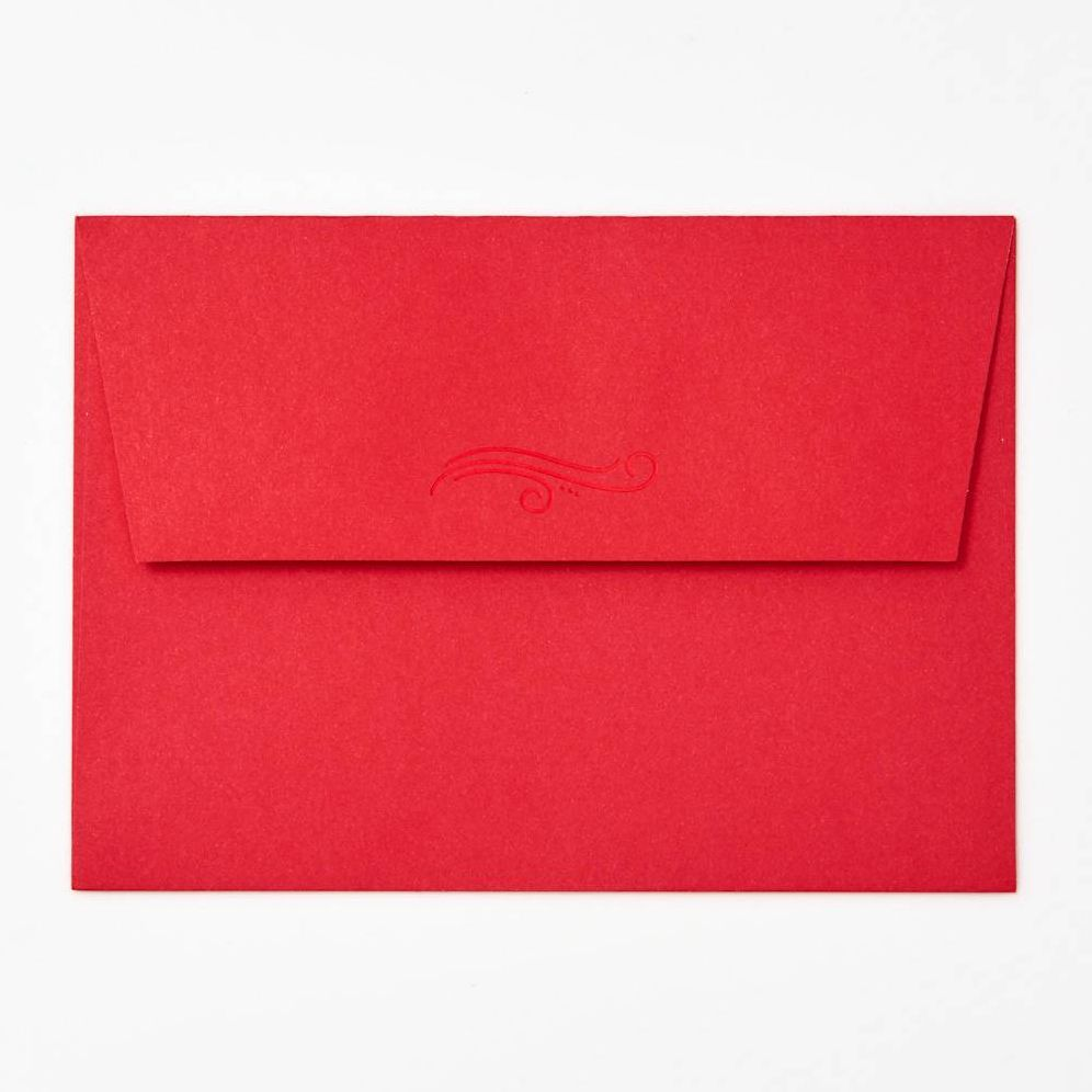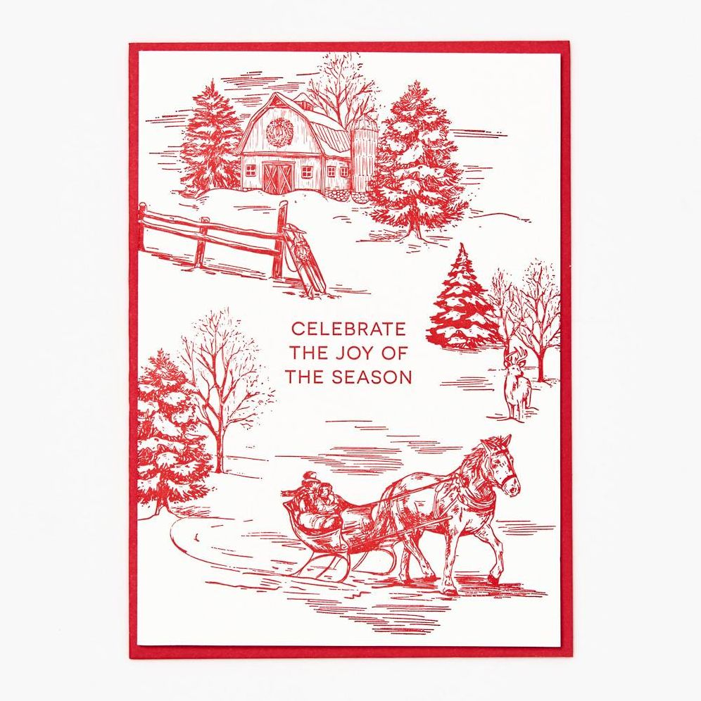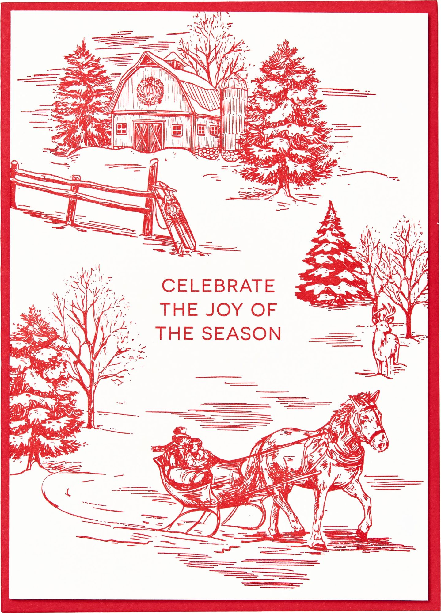 This lovely note card set of 10 features a traditional winter scene in a red toile design pattern. Foil details. A2 size for card & envelope.
