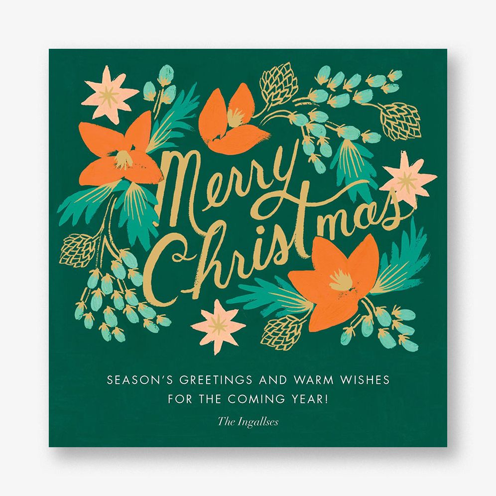 This gorgeous design from Rifle Paper Co. for Paperless Post will have your loved ones feeling the Christmas spirit this season. Printed on Mohawk ultra white. 120 lb. card stock that is soft to the touch and matches our superfine white envelopes. Paper is FSC certified and made using wind power.