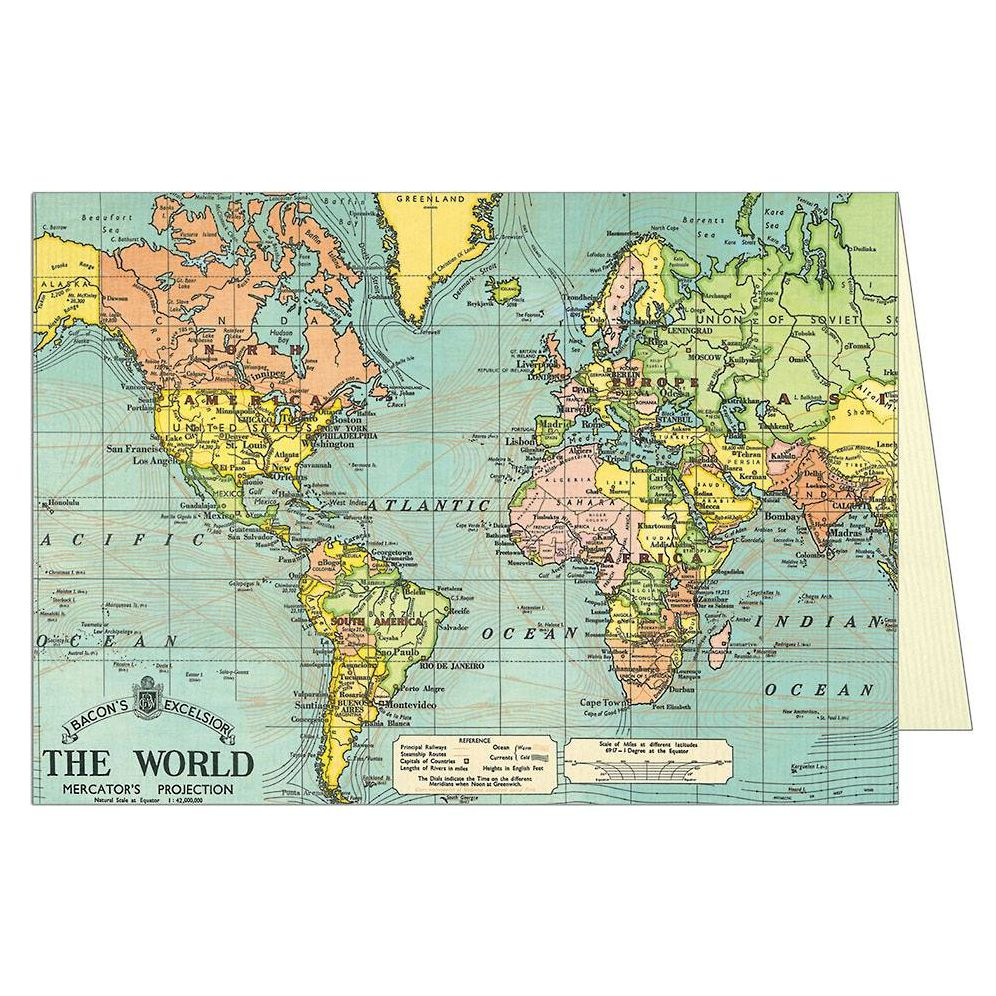 Blank greeting card featuring vintage world map imagery from the Cavallini & Co. archives with envelope. Printed on Cavallini’s signature Italian Paper