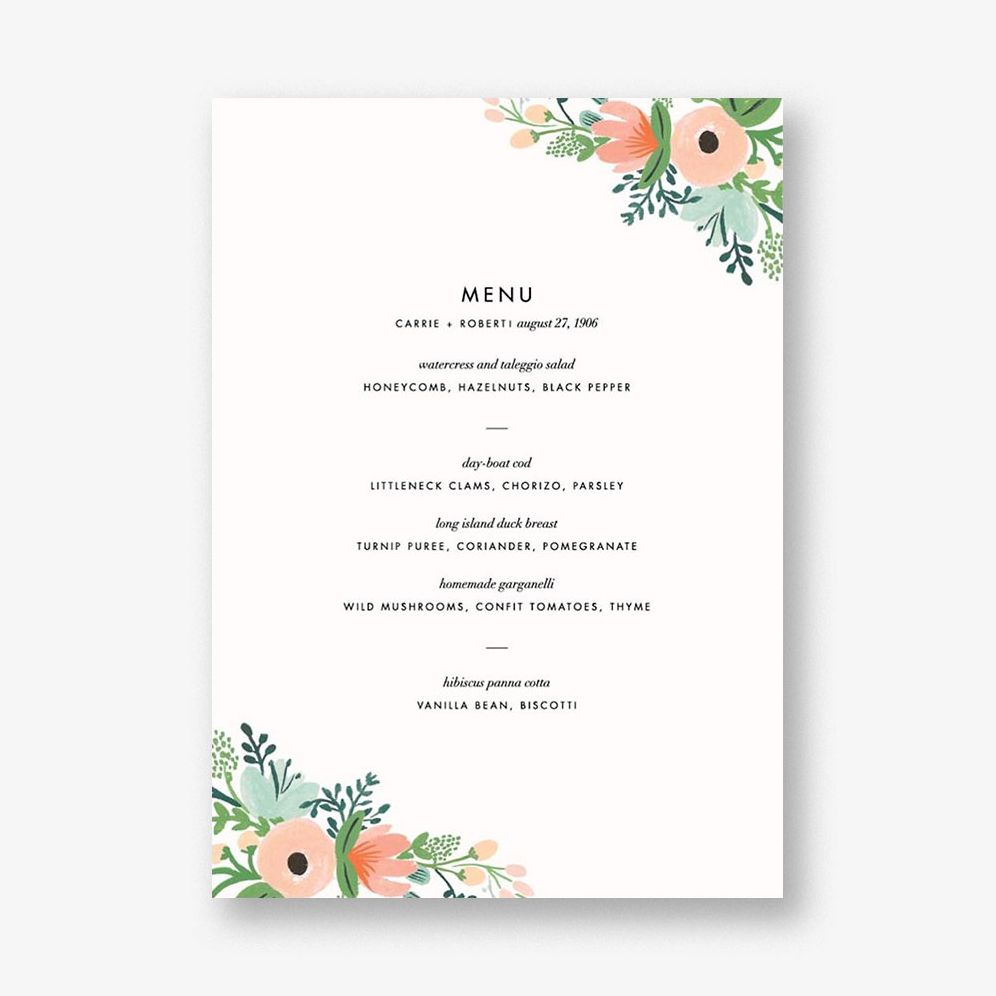 Send out adorable menus to get your guests excited for your big day. This Rifle Paper Co. for Paperless Post design is wrapped in wildflowers featuring florals in peachy pink tones with accents of greens. Printed on Mohawk superfine white 130 lb. card stock that is soft to the touch and matches our superfine white envelopes. Paper is FSC certified and made using wind power.