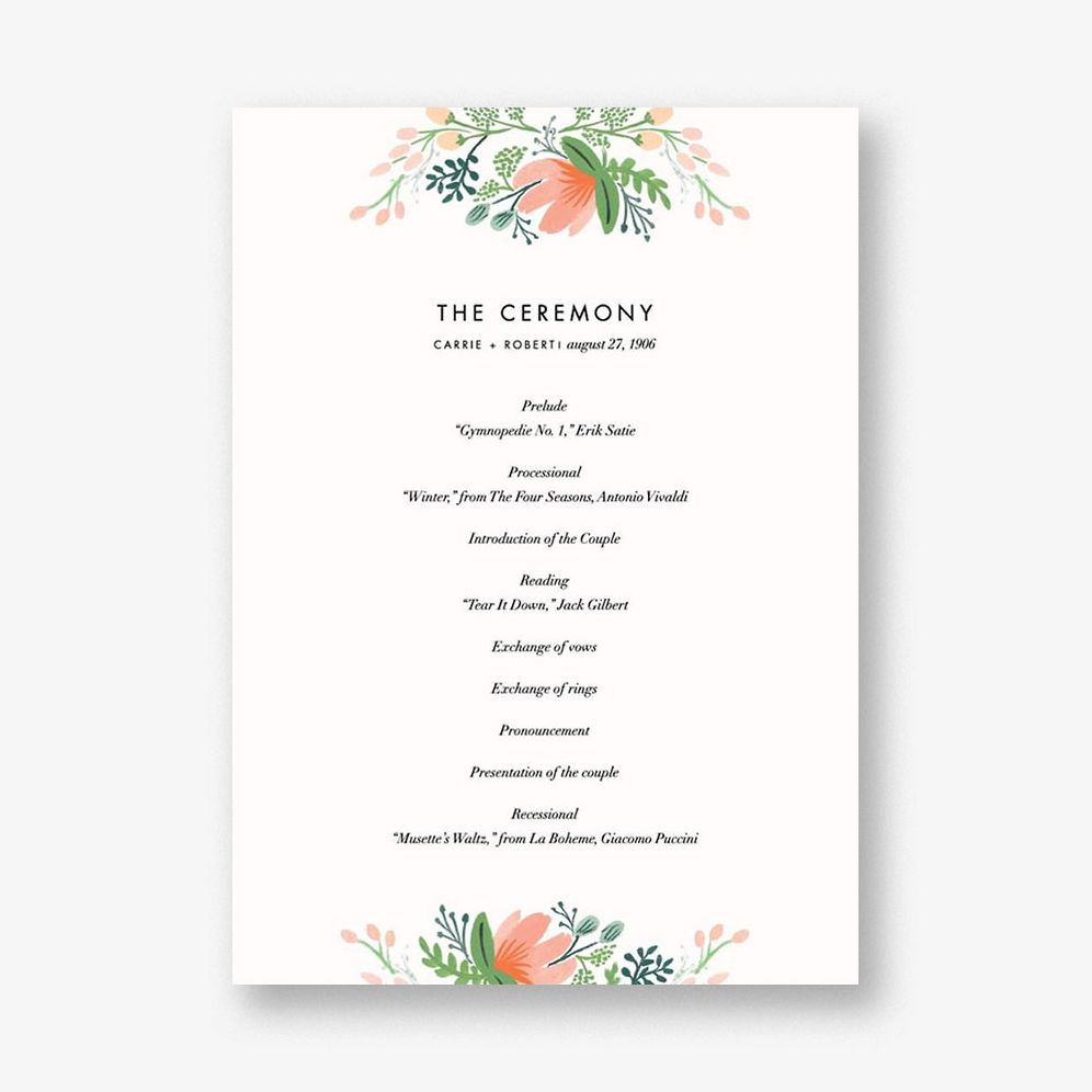 Send out adorable wedding programs to get your guests excited for your big day. This Rifle Paper Co. for Paperless Post design is wrapped in wildflowers featuring florals in peachy pink tones with accents of greens. Printed on Mohawk superfine white 130 lb. card stock that is soft to the touch and matches our superfine white envelopes. Paper is FSC certified and made using wind power.