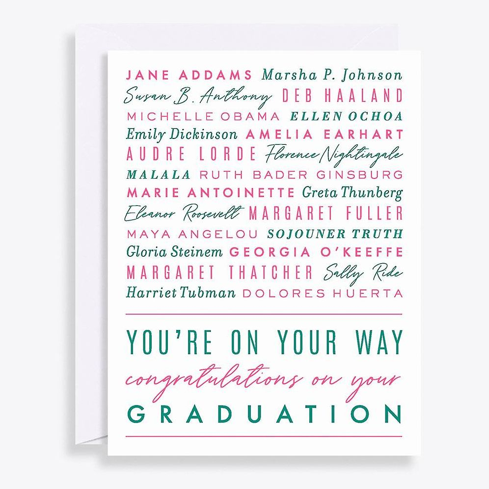 For the lady ready to make her way. this vibrant graduation card is perfect to send her all the encouragement. This card features a list of bold and brilliant women in history. A fantastic way to celebrate your female graduate. Letterpress. Blank inside. Paired with matching envelope. By Paper Source.