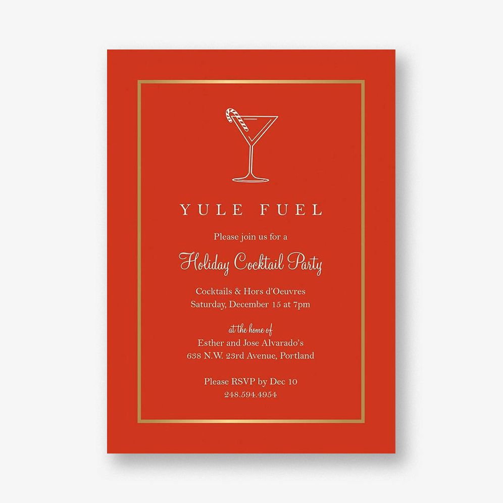Time to fuel up! Gather your loved ones for holiday festivities with this foil holiday party invitation. Printed on Mohawk ultra white 120 lb. card stock that is soft to the touch and matches our superfine white envelopes. Paper is FSC certified and made using wind power.