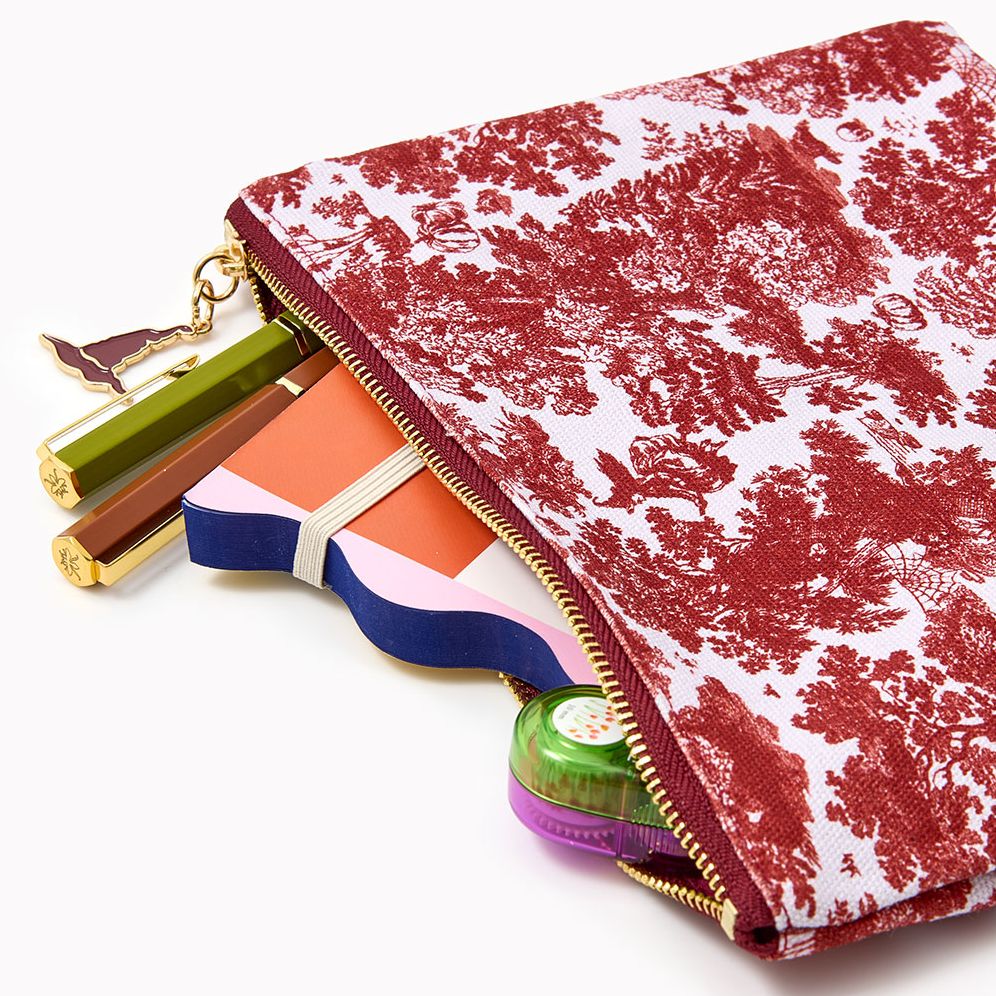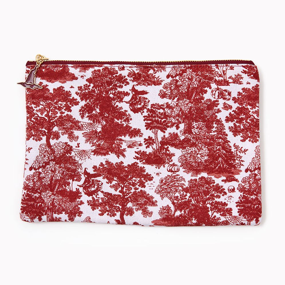 This vintge style pouch features small haunted details to add just the right amount of spooky sophistication to your day. Can you find all of the haunted hidden details from flying witches to tiny skulls?